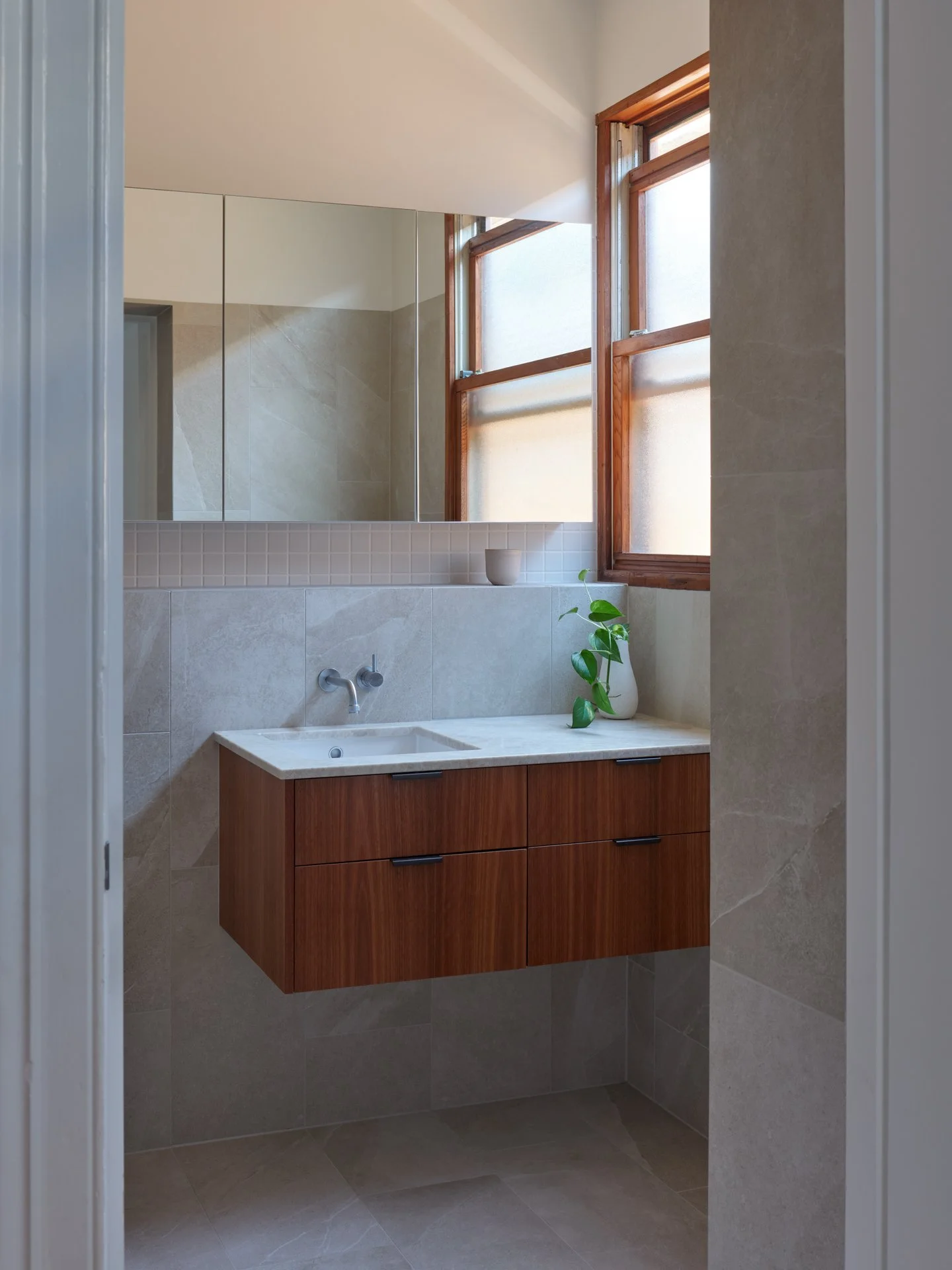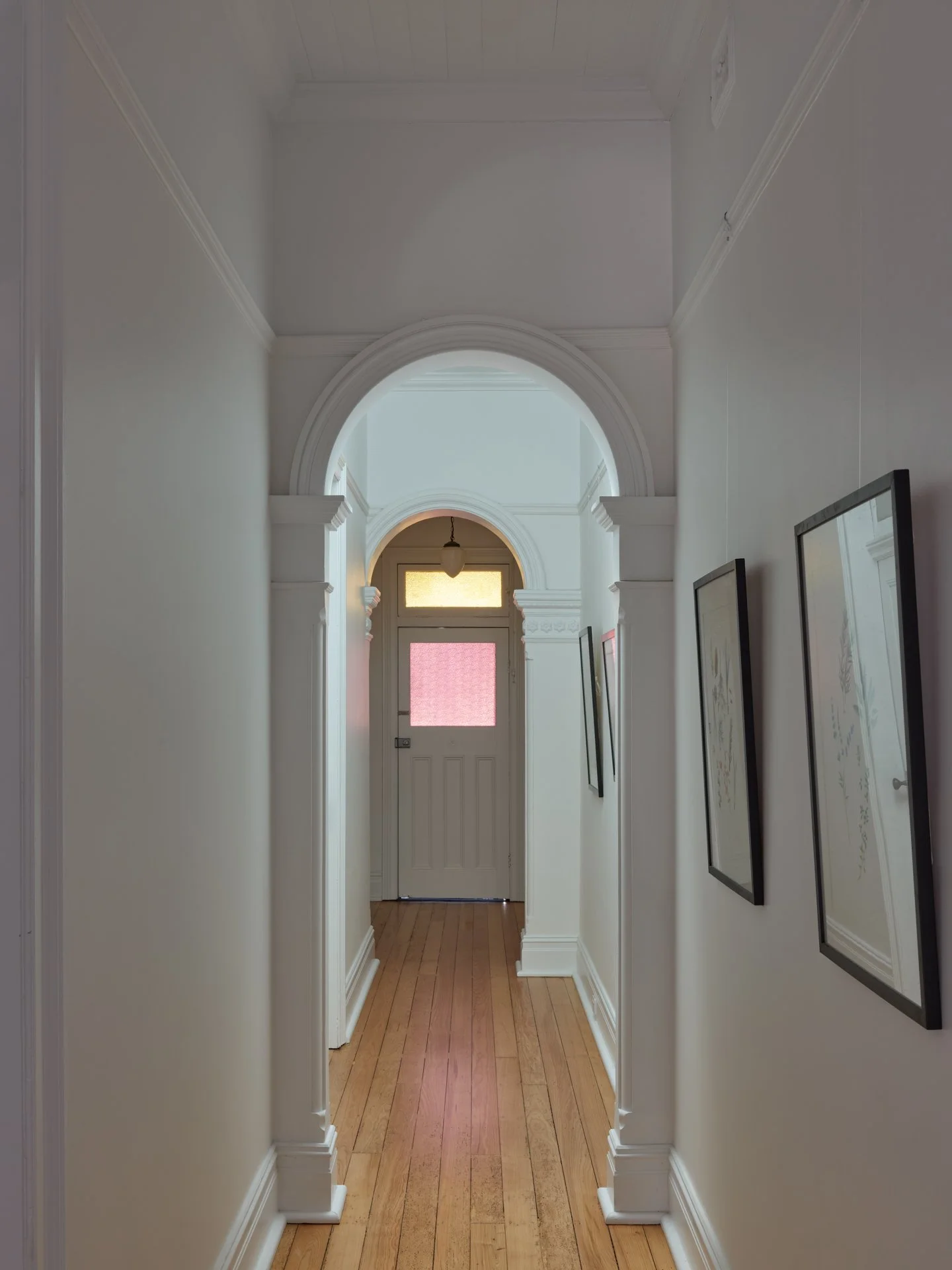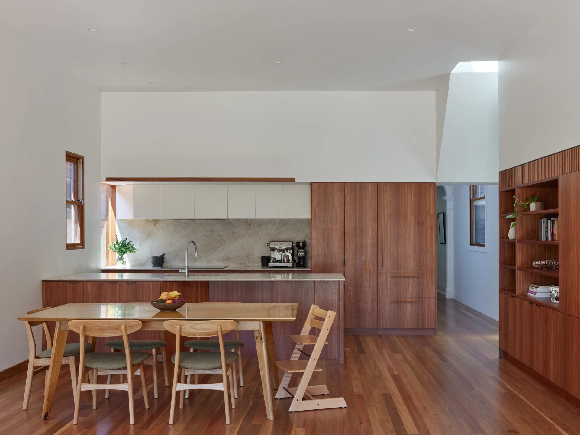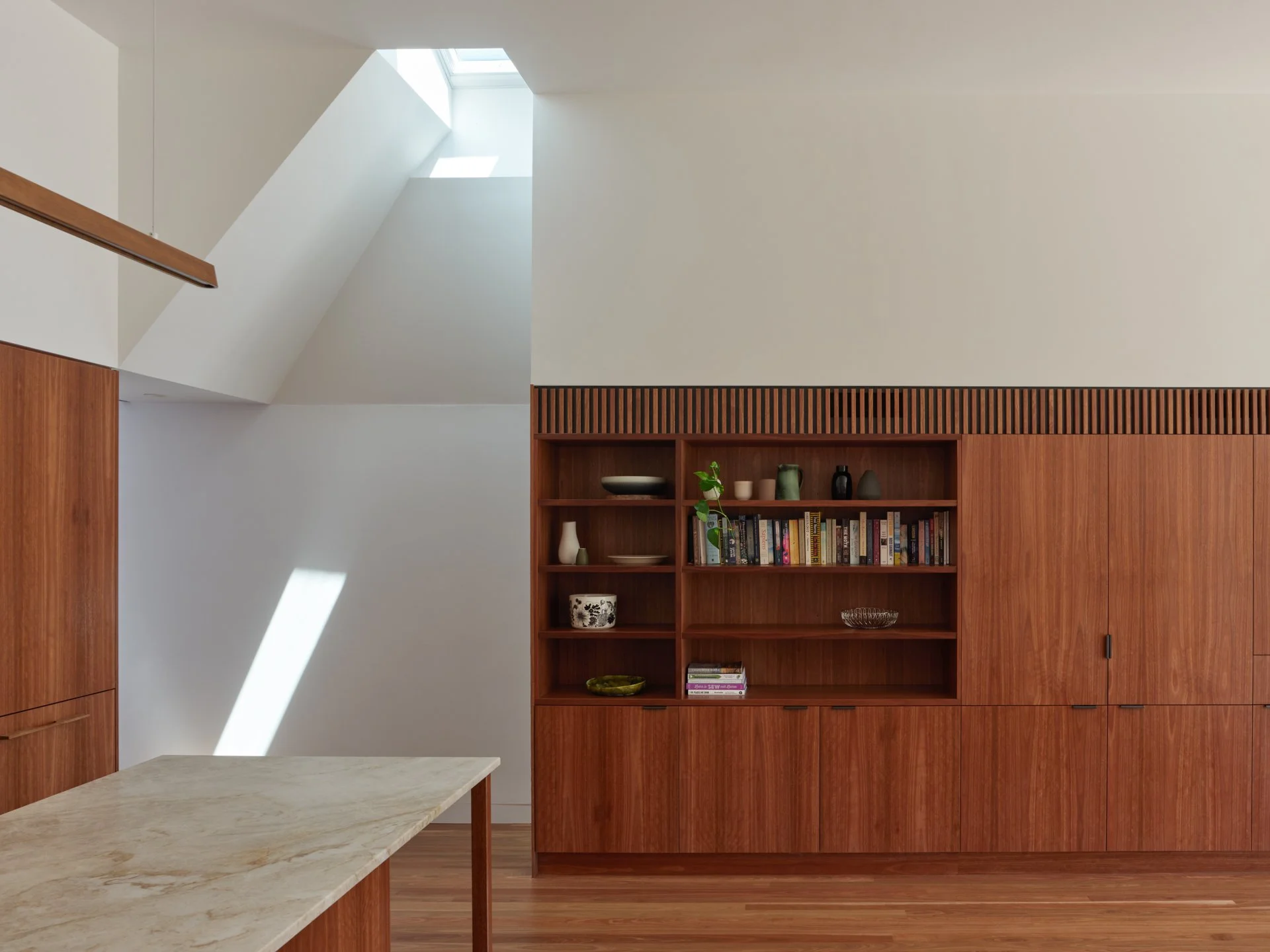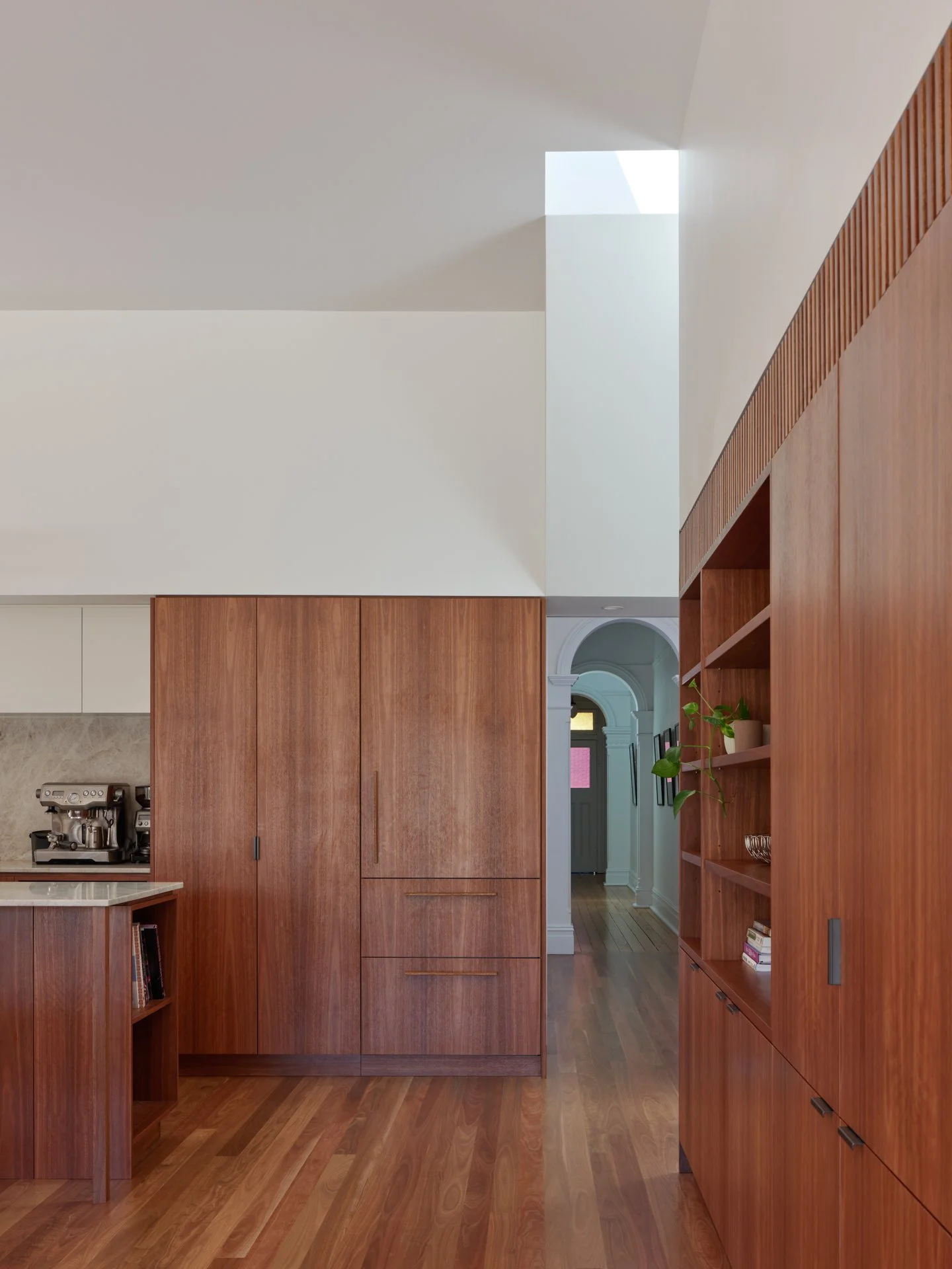 Balancing heritage character with modern function, this alteration and addition involved reconfiguring the rear of the home and introducing a private studio. The challenge was to honour original details while seamlessly integrating contemporary design. Every element—from the restored v-groove ceilings to the skylight perfectly positioned over the walkway—was carefully considered to honour the home’s past while enhancing its liveability.